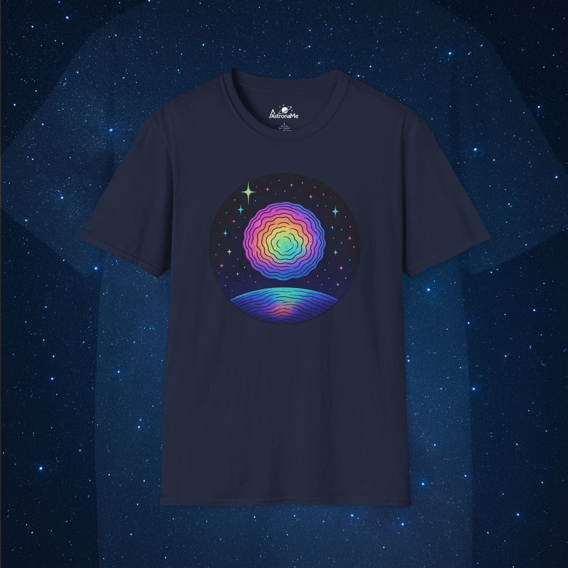 Step into another dimension with this psychedelic space tee featuring a rainbow ripple sunburst rising over a surreal alien horizon. Surrounded by dreamy stars and a nebula glow, this design blends retro-futurism with chill cosmic energy. A perfect fit for stargazers, dreamers, and fans of vibrant vibes.