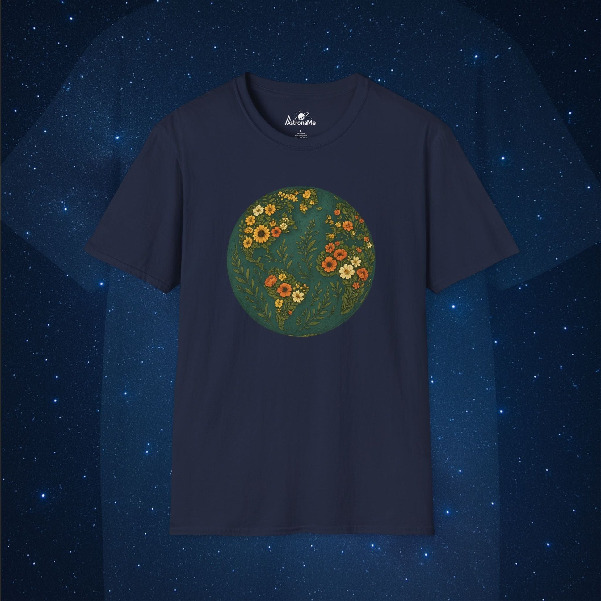 Celebrate the beauty of our planet with this stunning floral Earth tee. Featuring a lush botanical pattern where continents bloom with yellow and orange flowers, this shirt is a gentle yet powerful nod to nature, growth, and harmony. A perfect choice for eco-conscious souls, plant lovers, and Earth Day fashionistas.