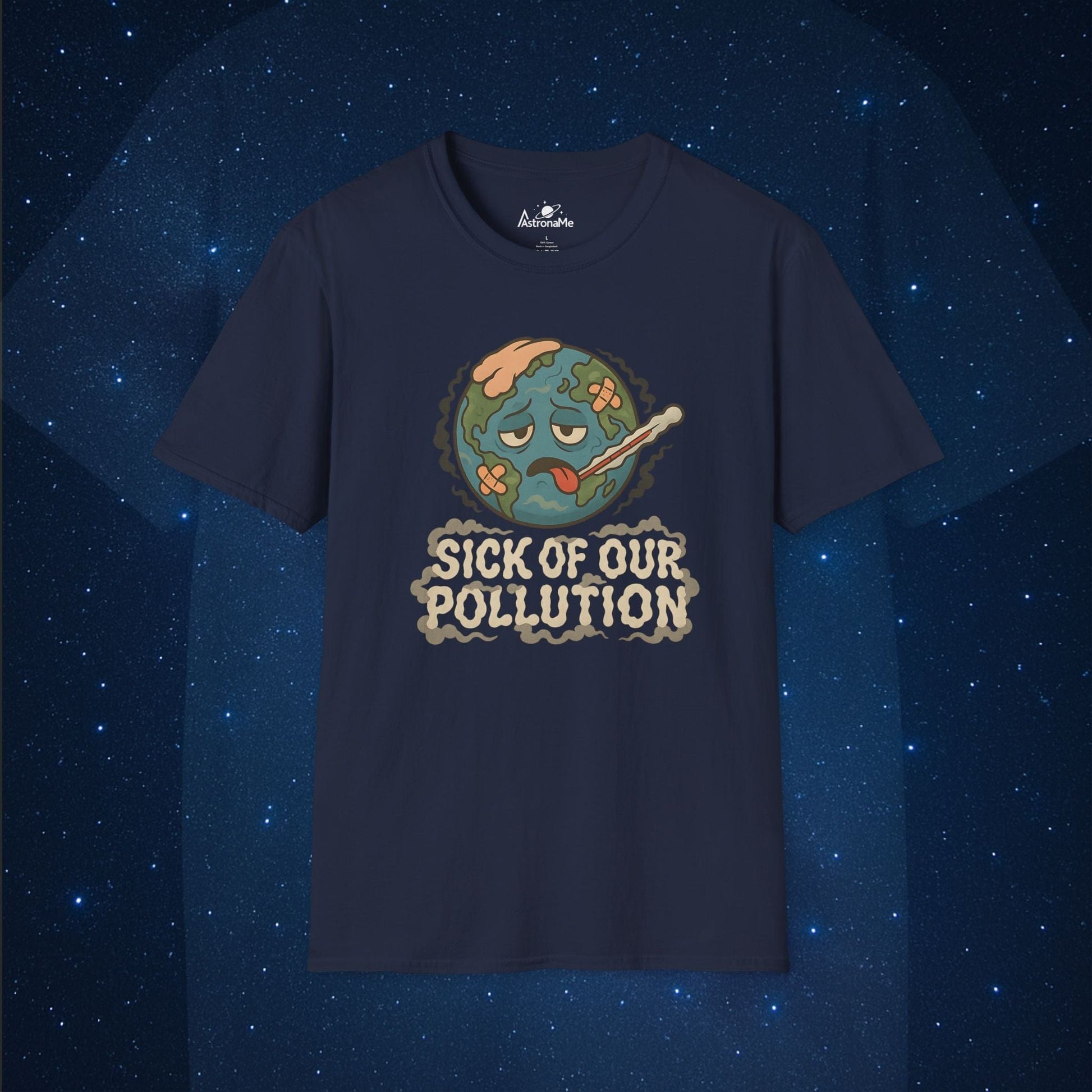 The planet’s not feeling too hot—and that’s the problem. This bold tee features a cartoon Earth looking green (in a bad way), complete with bandages, sweat, and a thermometer, surrounded by a smokey font that reads “Sick of Our Pollution.” It's the perfect combo of humor and truth for environmentalists who want to make a statement without saying a word.