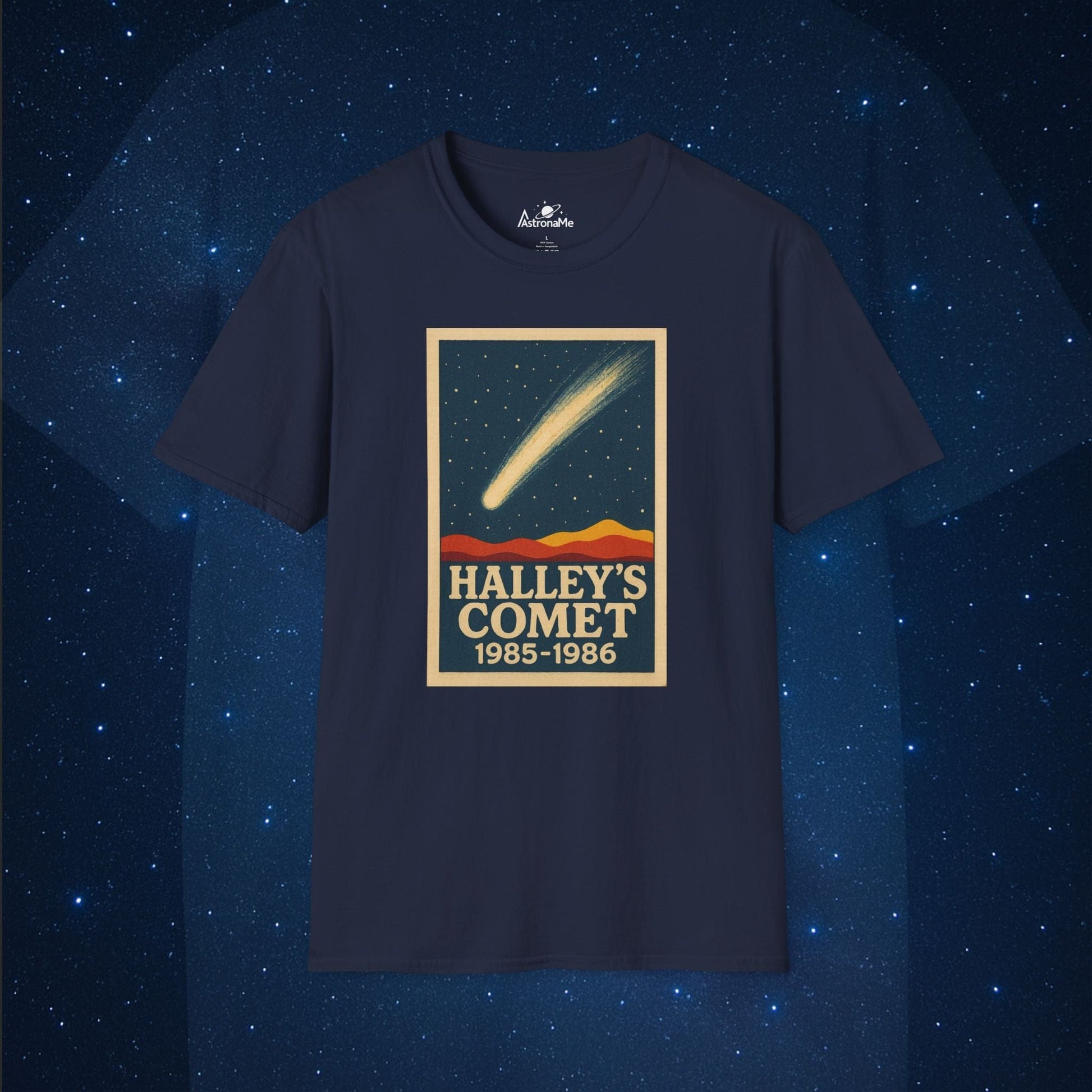 Capture the magic of a once-in-a-lifetime event with our Halley’s Comet 1985–1986 Tee. Featuring a retro poster-style design with a bright comet streaking across a starlit sky above a warm horizon, this shirt is perfect for astronomy lovers, vintage art fans, and space history buffs.
