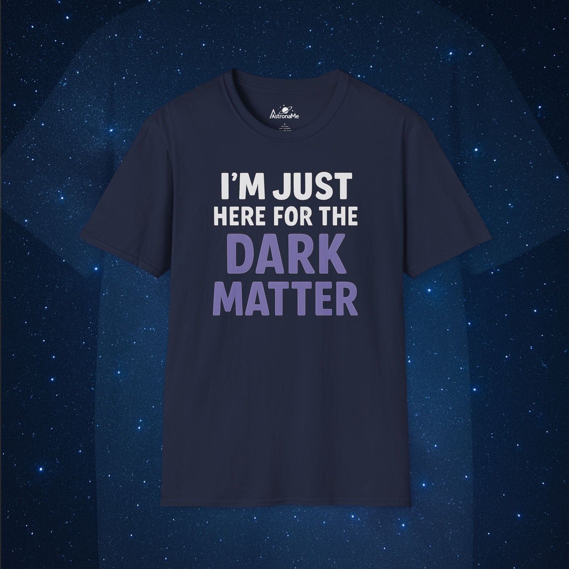 - 🌌 Bold typographic design with “I’m Just Here for the Dark Matter”