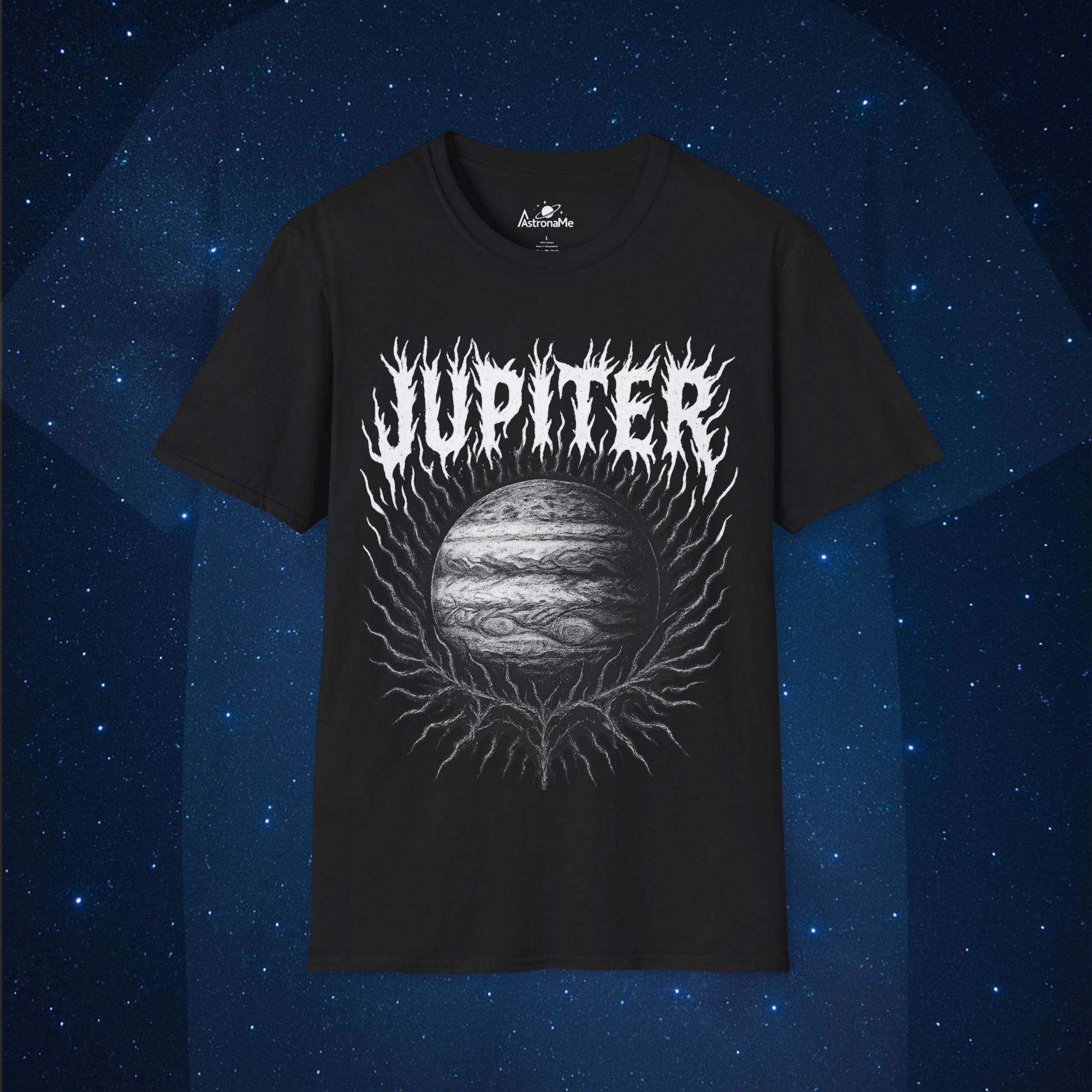 The biggest planet becomes your boldest statement. This T-shirt features Jupiter sculpted in swirling, storm-lashed detail, wrapped in a violent spike-mass aura and crowned with jagged metal-style typography. A gas giant with colossal energy—reimagined as a raw cosmic emblem.