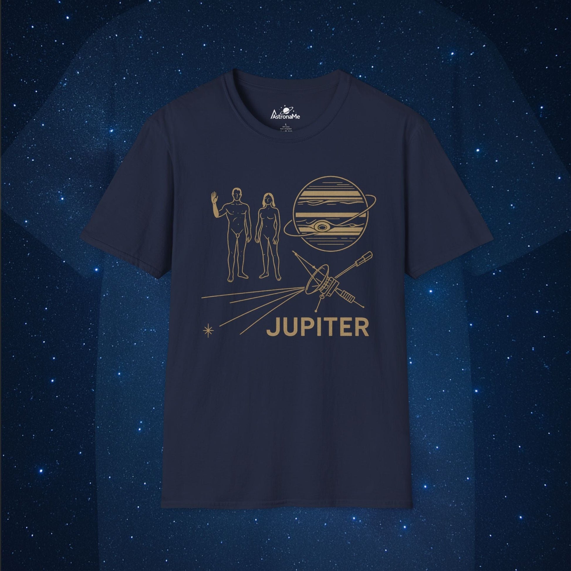 Celebrate humanity’s message to the stars with this Jupiter Pioneer Plaque T-Shirt. Featuring iconic artwork inspired by the Pioneer spacecraft's interstellar plaque—complete with the human figures, spacecraft, and the mighty planet Jupiter—this design pays tribute to our deep space journey and curiosity beyond the solar system.