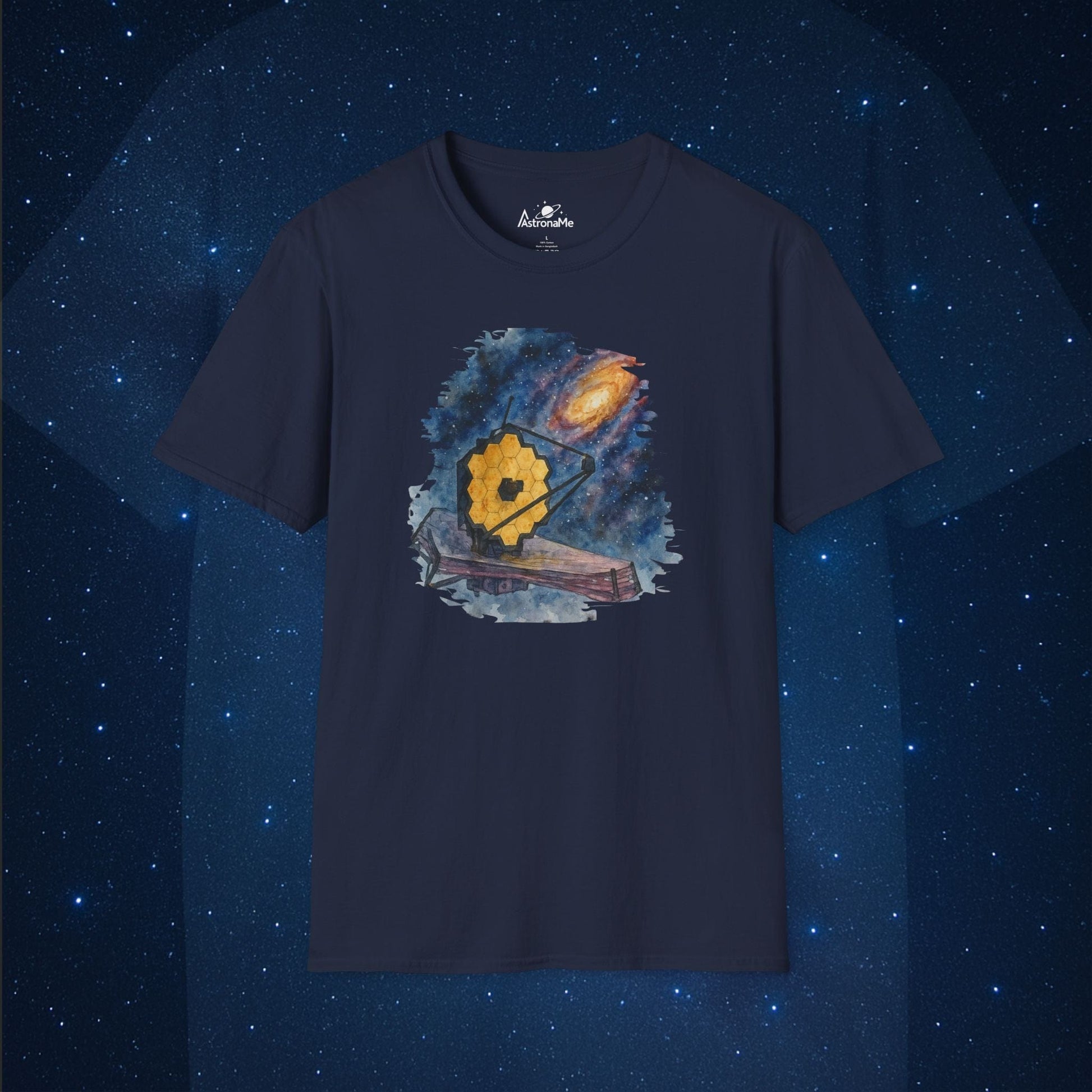 Bring the beauty of deep space to your wardrobe with our Watercolor JWST Tee. Featuring the James Webb Space Telescope in stunning watercolor style, gazing into a colorful galaxy, this shirt is perfect for astronomy fans, artists, and anyone who loves the blend of science and art.