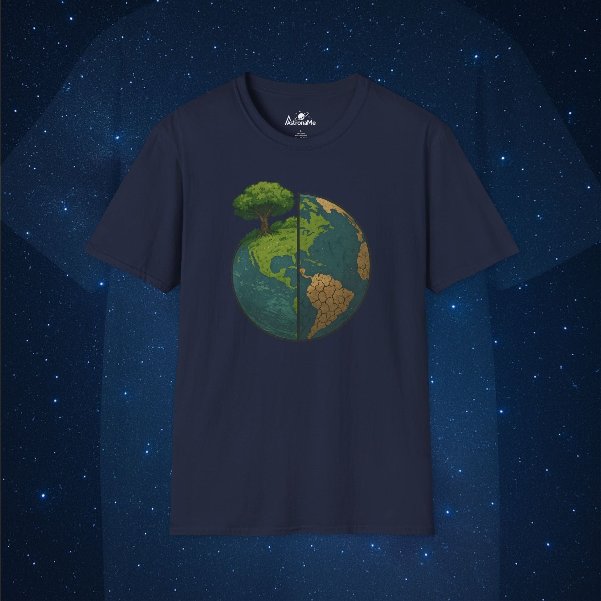 A world divided. This powerful graphic tee features Earth split in two—one half lush with a tree and greenery, the other cracked, dry, and barren. It’s a striking reminder of what’s at stake in the climate crisis. Wear it to spark conversation, raise awareness, and show you care about the future of our planet.
