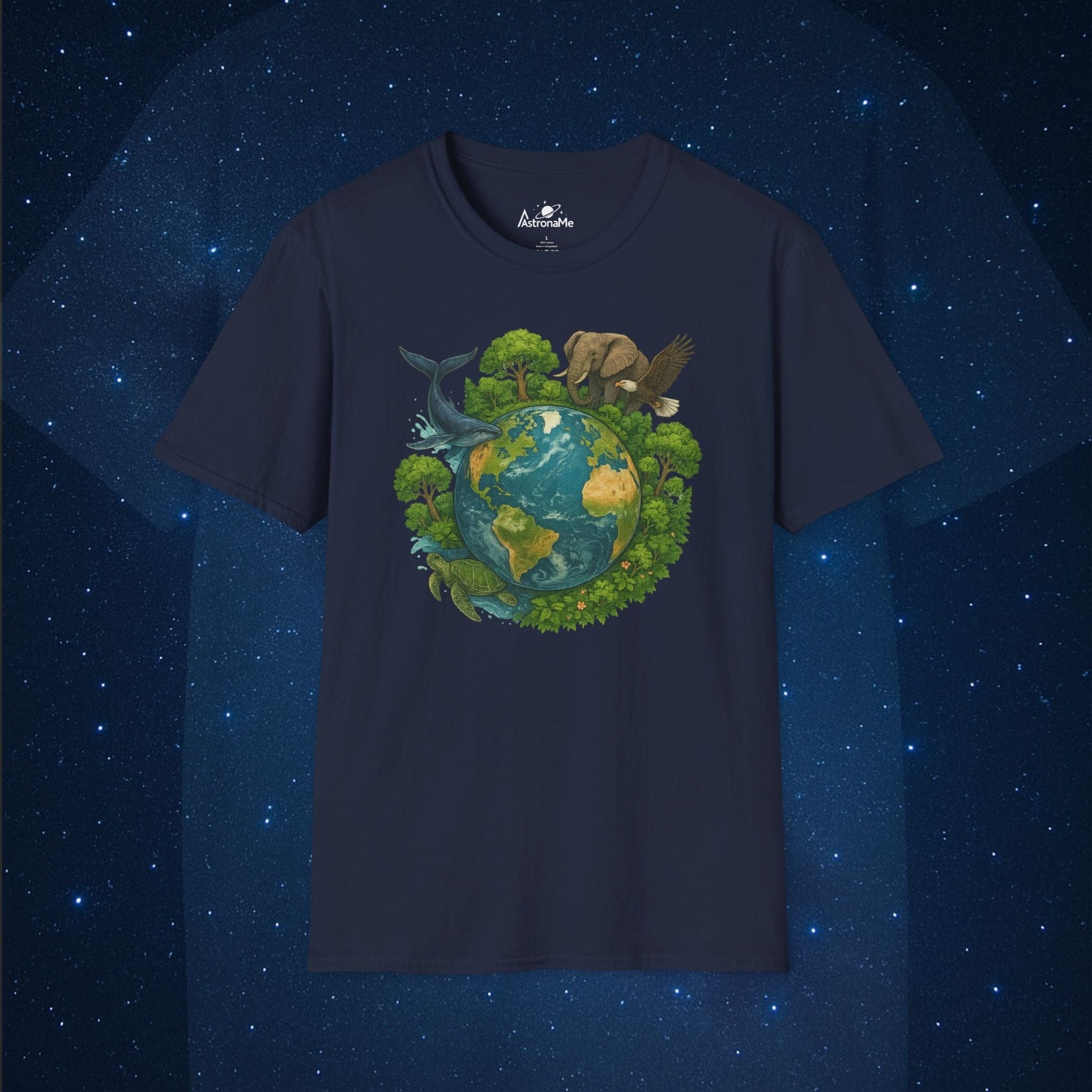 Celebrate the rich beauty of life on Earth with this vibrant and heartfelt tee. Featuring a lush green planet surrounded by thriving wildlife—like an elephant, eagle, whale, and forest creatures—this design honors biodiversity and the importance of protecting our one and only home. It’s a bold visual reminder that every species matters.