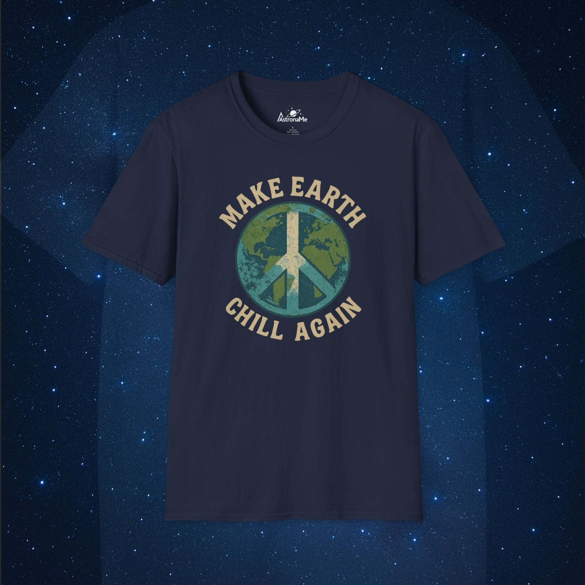 pread peace and climate awareness with a retro twist. This tee features Earth styled with a bold peace sign overlay and the phrase “Make Earth Chill Again.” Whether you're rallying for sustainability or just vibing with eco-conscious fashion, this shirt brings a cool message with serious heart.