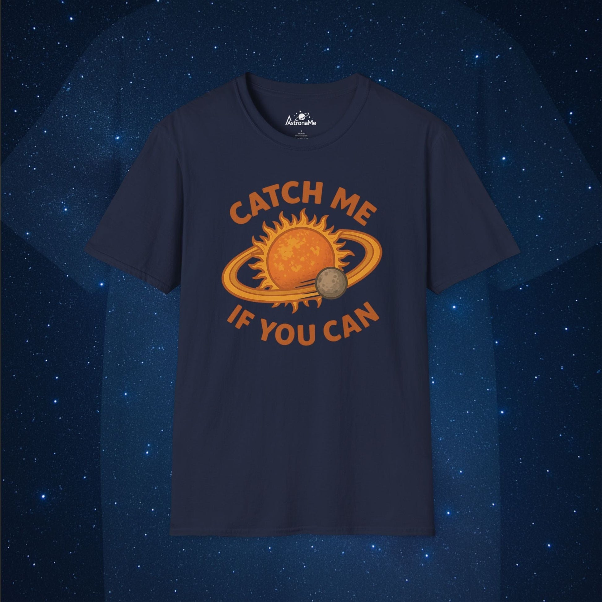 Blink and you’ll miss it—Mercury’s blazing by! This playful tee captures the speed and sass of the solar system’s fastest planet. Featuring Mercury zipping past the Sun with the phrase “Catch Me If You Can,” it’s a fun tribute to cosmic motion, planetary pride, and space nerd energy.