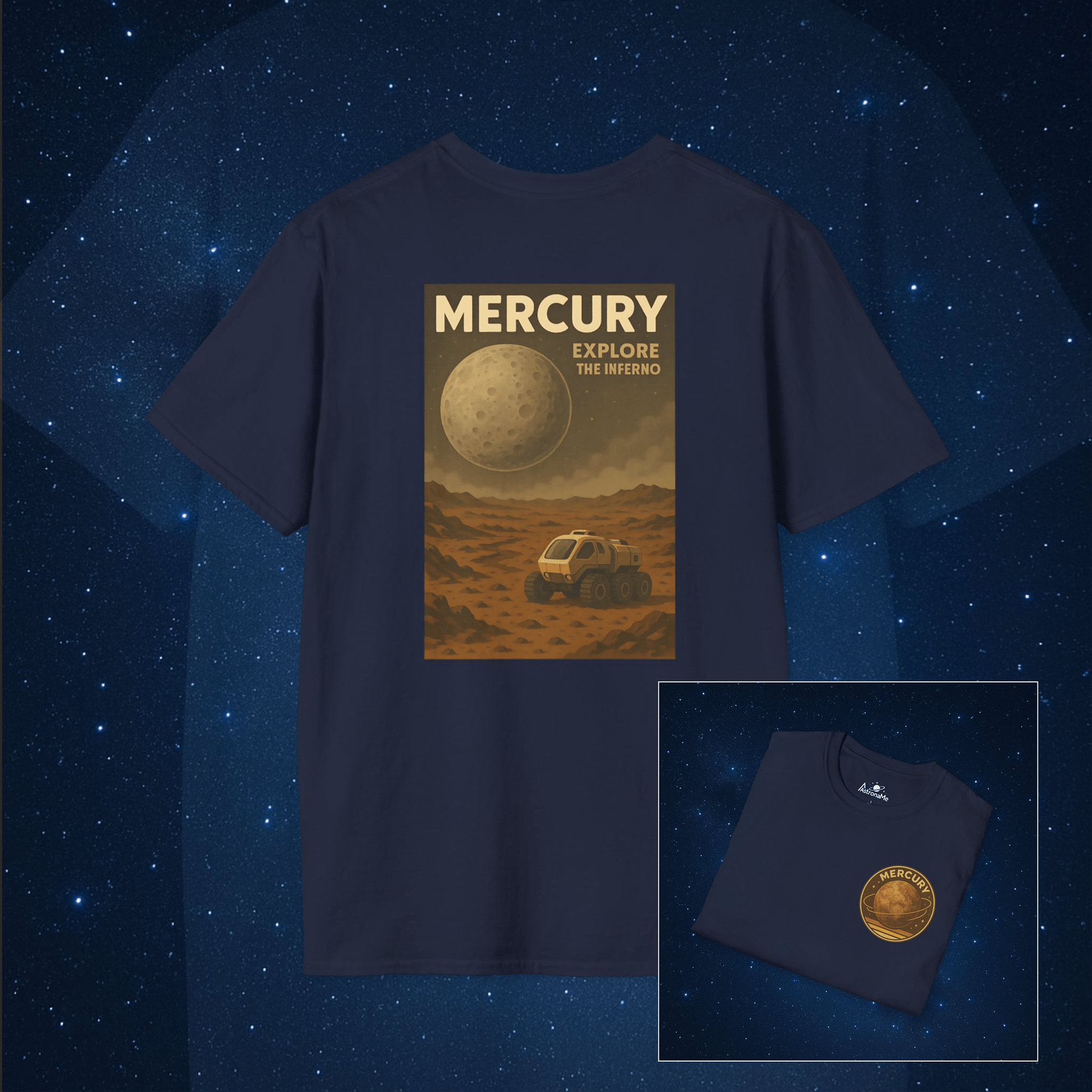 Get up close with the hottest planet in the solar system—without breaking a sweat. This Mercury: Explore the Inferno tee features a retro space tourism poster design, showcasing a rugged rover exploring Mercury’s scorched surface beneath its cratered sky.