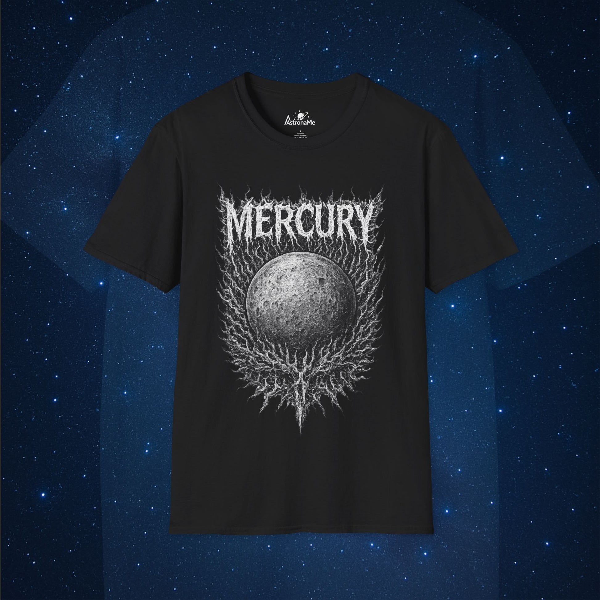 The smallest world becomes one of your loudest designs. This T-shirt features Mercury sculpted in crater-heavy, bone-white texture, surrounded by a violent spike-mass aura and topped with jagged metal-style lettering. The fast, scorching world reimagined as a cold, brutal cosmic emblem.