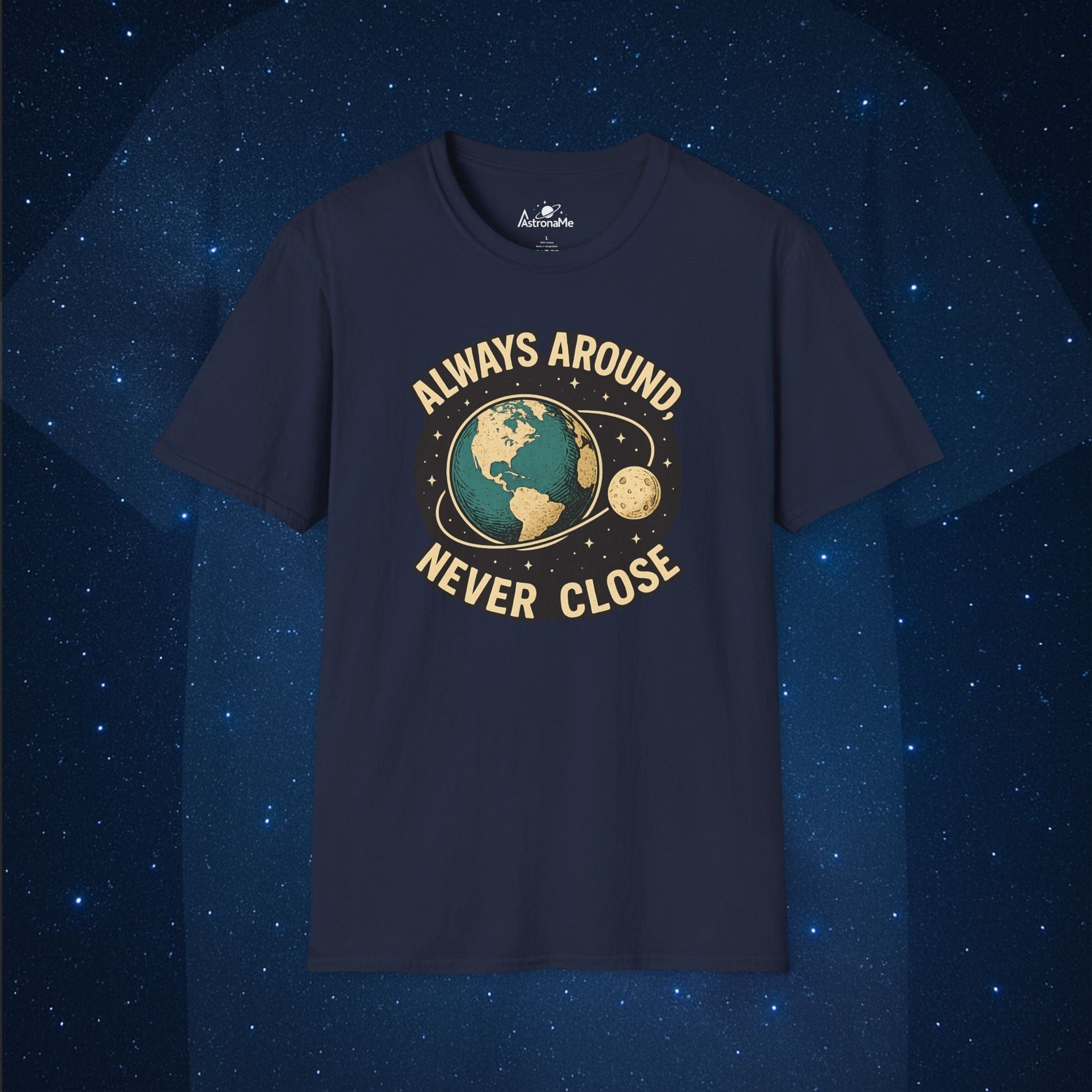 Celebrate long-distance relationships—cosmic style. This witty and nostalgic tee features Earth and the Moon caught in their eternal orbit, accompanied by the perfectly relatable phrase: “Always Around, Never Close.” Whether you're feeling a little distant or just vibing with some space humor, this retro-inspired graphic will keep your style grounded and galactic.