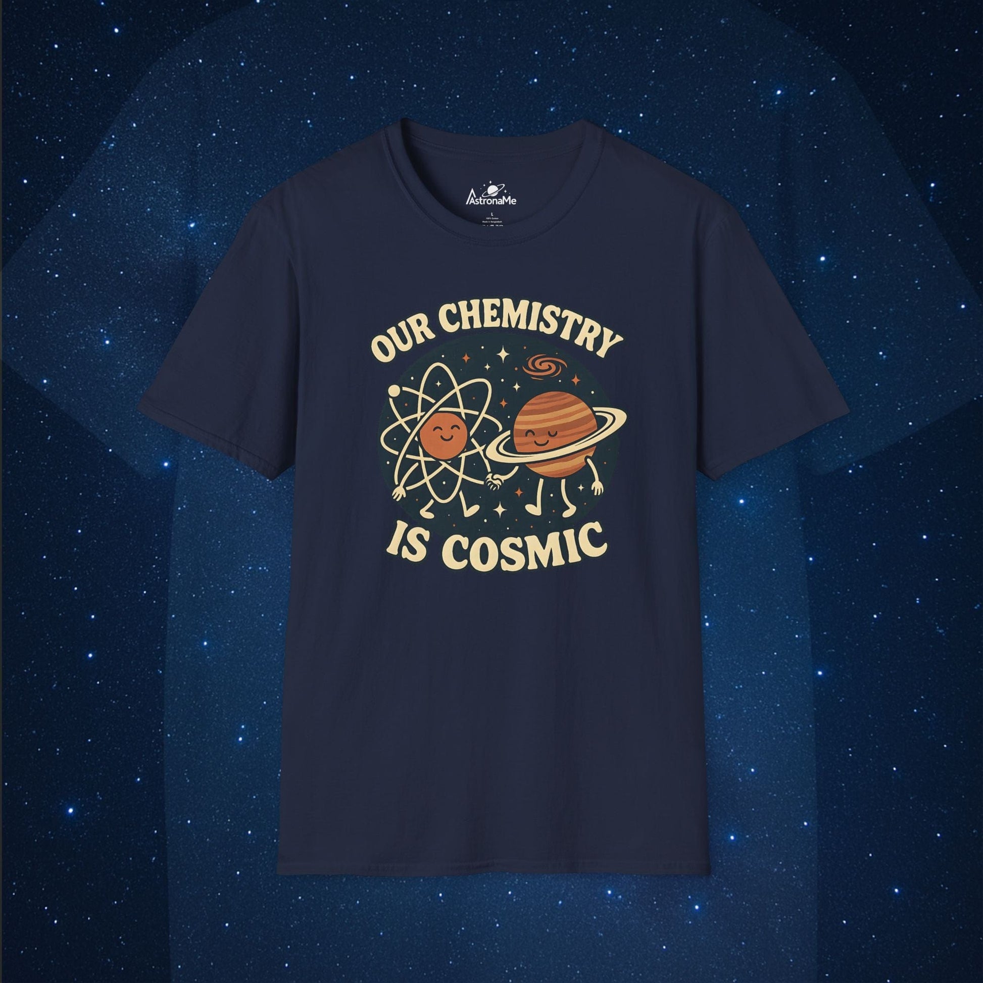 Celebrate your universal connection with our “Our Chemistry is Cosmic” t-shirt! Featuring an adorable illustration of an atom and a planet holding hands in the starry cosmos, this design is perfect for science lovers, space geeks, and couples with stellar vibes. Whether it's Valentine's Day, an anniversary, or just because—this tee is a fun way to show your love is out of this world.