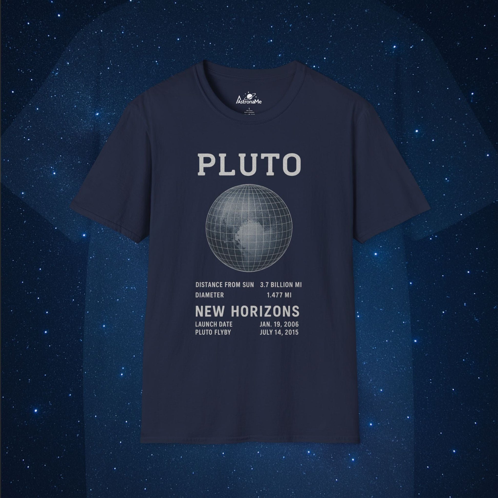 Celebrate one of NASA’s greatest deep space missions with this Pluto New Horizons T-Shirt. Featuring a wireframe illustration of Pluto and key facts from the historic flyby—including distance from the sun, diameter, and the New Horizons mission timeline—this design is a must-have for space lovers and science buffs.