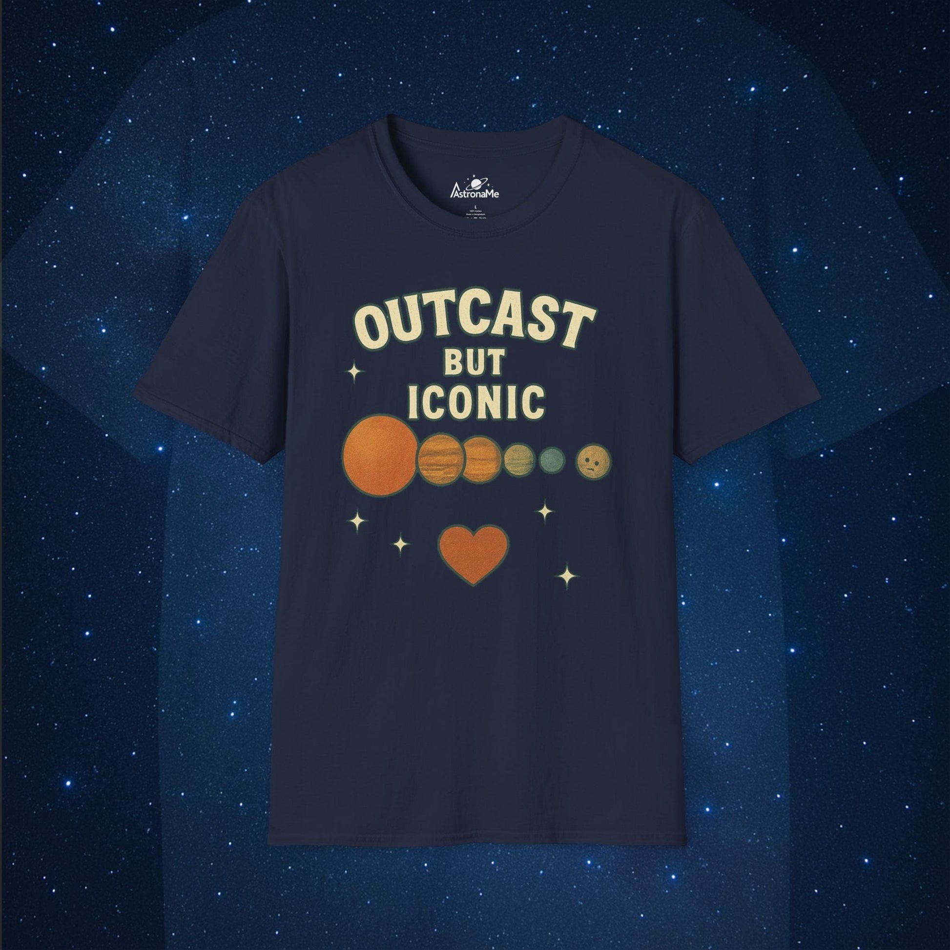 Pluto may be small, but its legend is massive. This Outcast But Iconic T-shirt gives love to the one planet-turned-dwarf-planet that still has our hearts. Featuring a stylized planetary lineup with Pluto standing proud at the end, this tee is perfect for space lovers, Pluto defenders, and anyone who embraces being different.