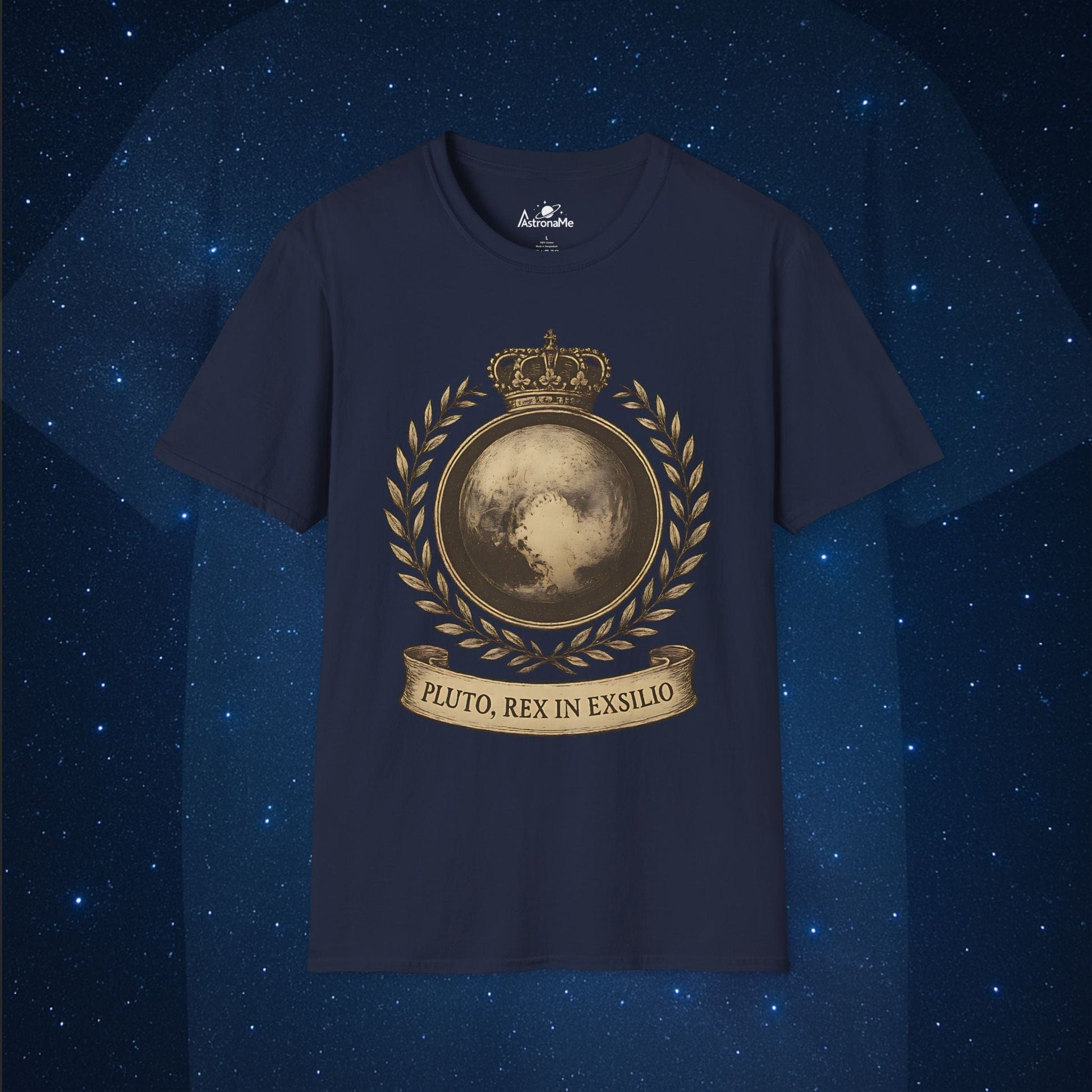 Bow to the one true king of the Kuiper Belt with this majestic Pluto, Rex in Exsilio T-shirt. Latin for “King in Exile,” this design crowns the beloved dwarf planet in royal gold and laurel glory, perfect for Pluto loyalists, space romantics, and anyone who knows that true greatness can't be downgraded.