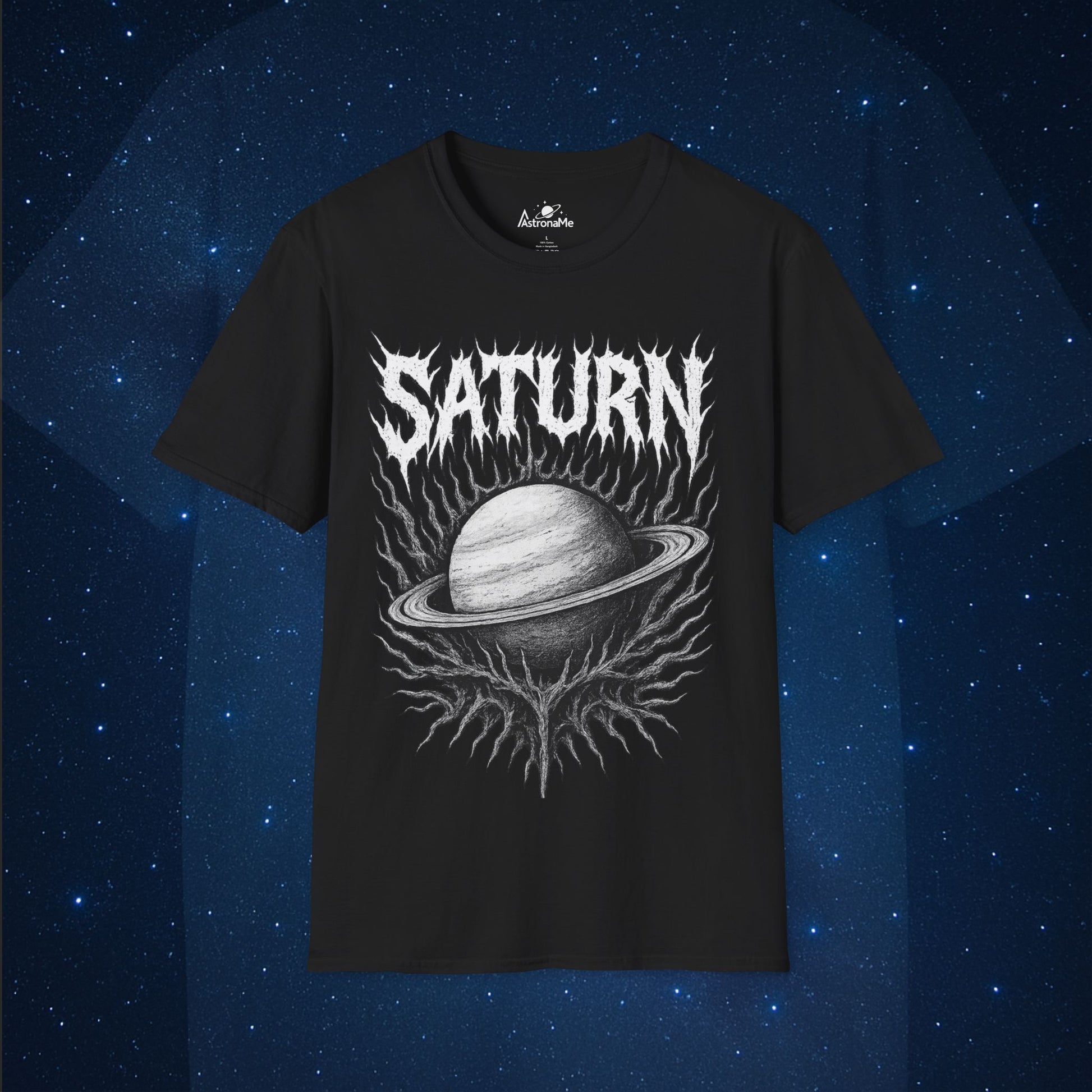 The universe’s most iconic rings get a full heavy-metal makeover. This T-shirt features Saturn carved in razor-sharp detail, its rings slicing across the design like cosmic blades. Surrounded by a chaotic spike-mass aura and crowned with jagged bone-text typography, this is Saturn reimagined as a fierce celestial emblem.