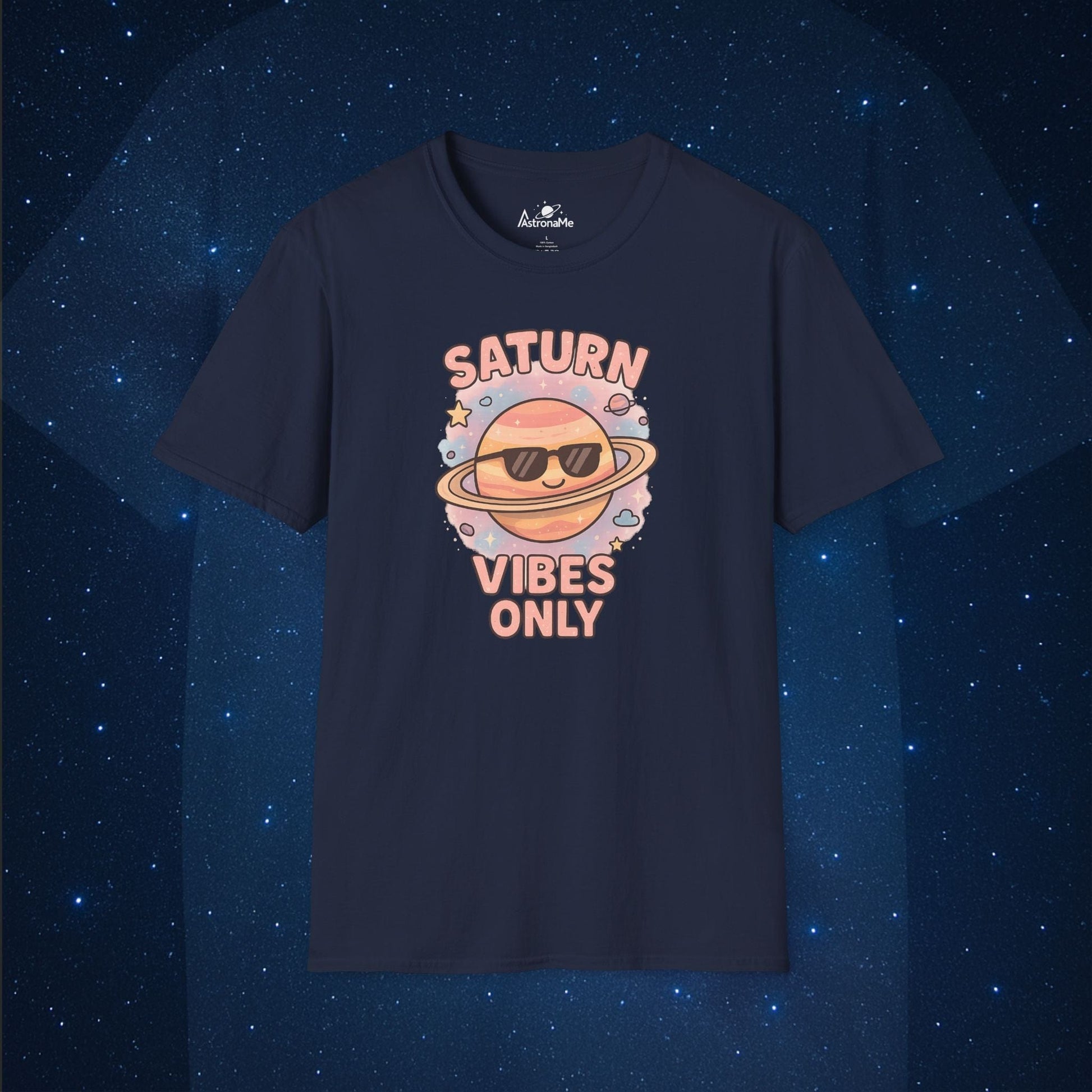 Catch cosmic cool with this adorable Saturn Vibes Only T-shirt! Featuring a pastel-toned Saturn rocking shades and surrounded by stars, this design is all about bringing laid-back, out-of-this-world energy to your everyday look. Perfect for space lovers, kawaii fans, and anyone living life on another planet.