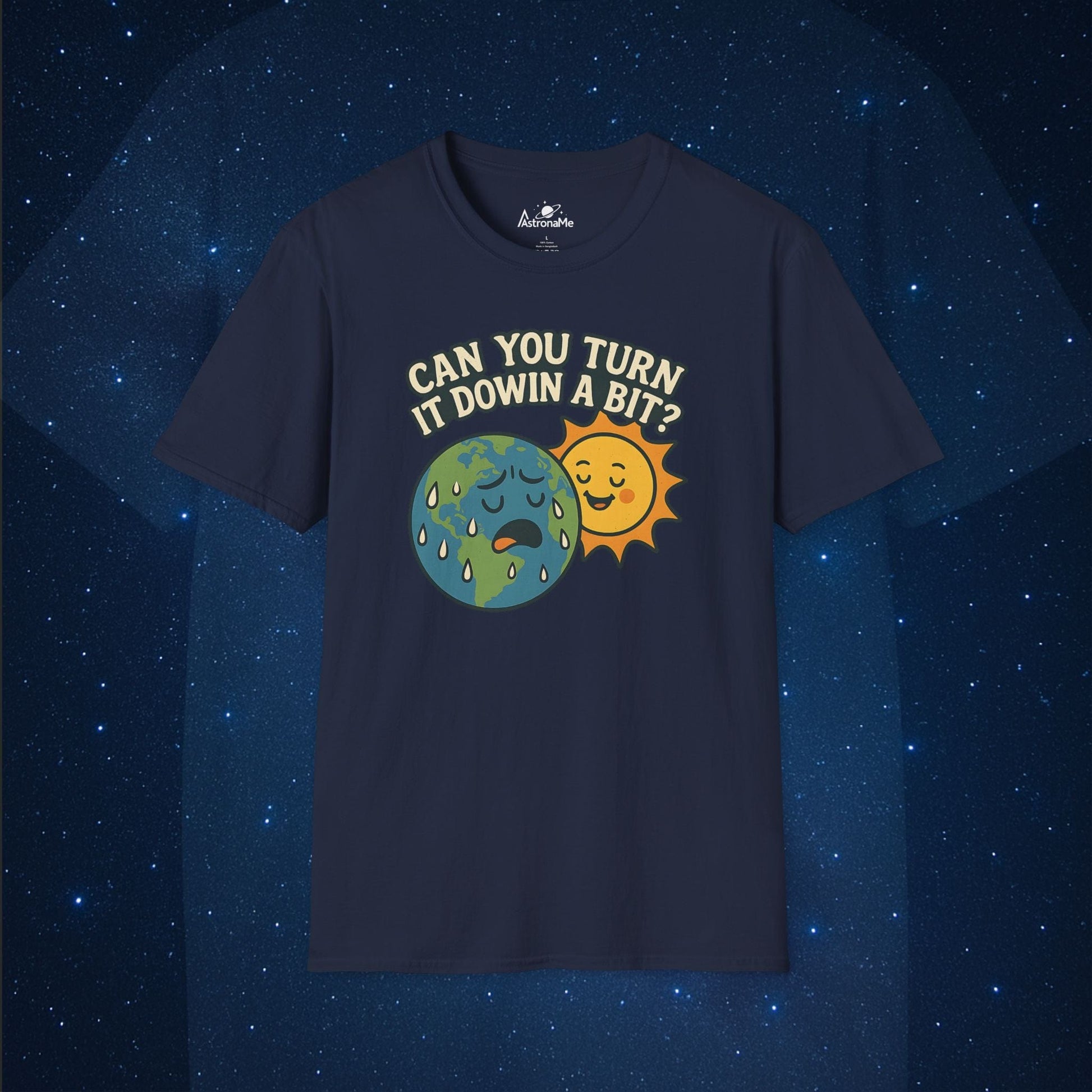Things are heating up—and Earth has questions. This adorable and cheeky tee features a sweating Earth asking the always-glowing Sun to dial it back. A clever climate-themed design with cosmic charm and a subtle nod to global warming awareness, all wrapped in a cute cartoon style.