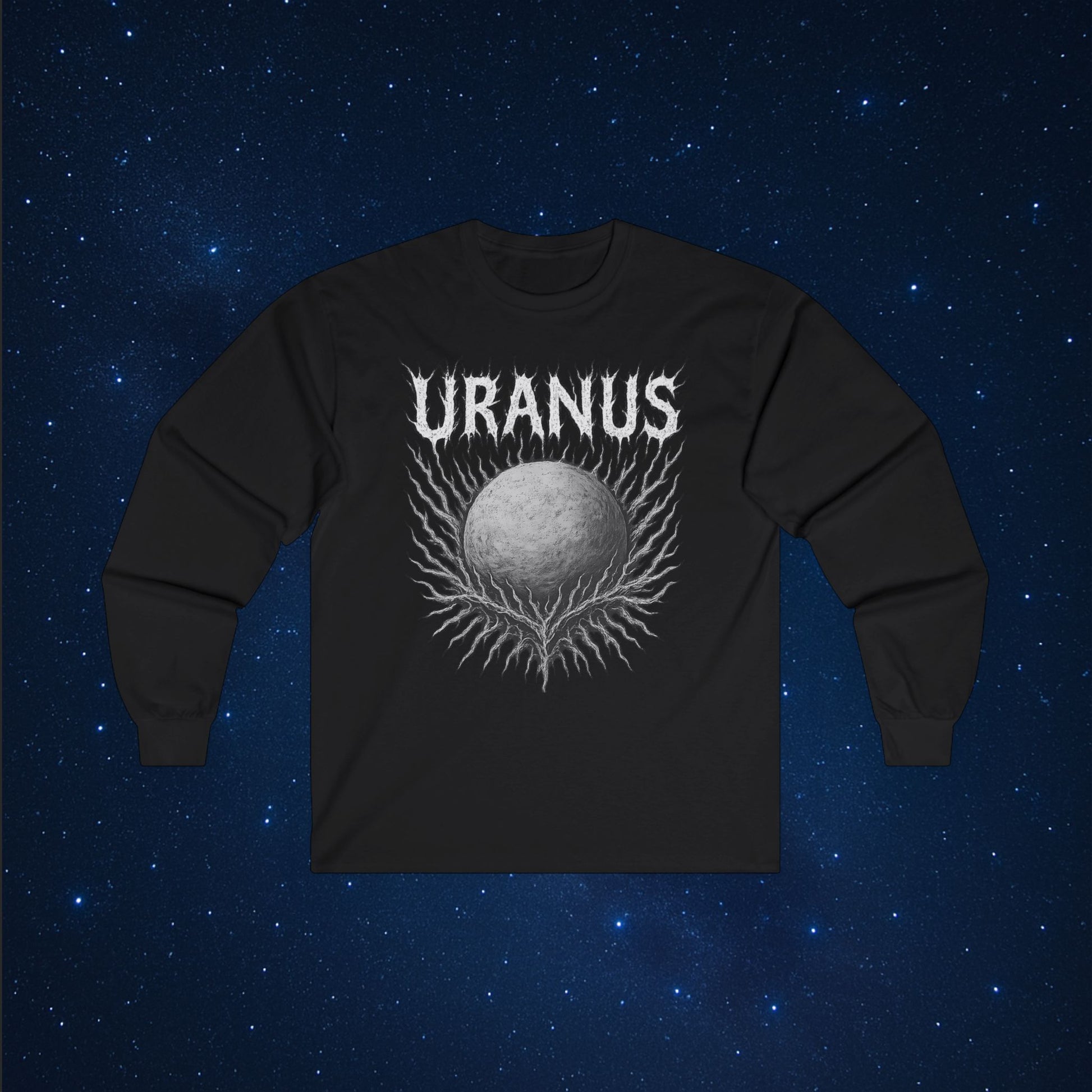 Step into the deep, icy edge of the Solar System with a design forged straight from AstronaMe’s Space is Metal collection. This long sleeve features Uranus rendered in brutal, bone-like detail, wrapped in an explosive spike-mass aura that feels ripped from a cosmic doom-metal album cover.