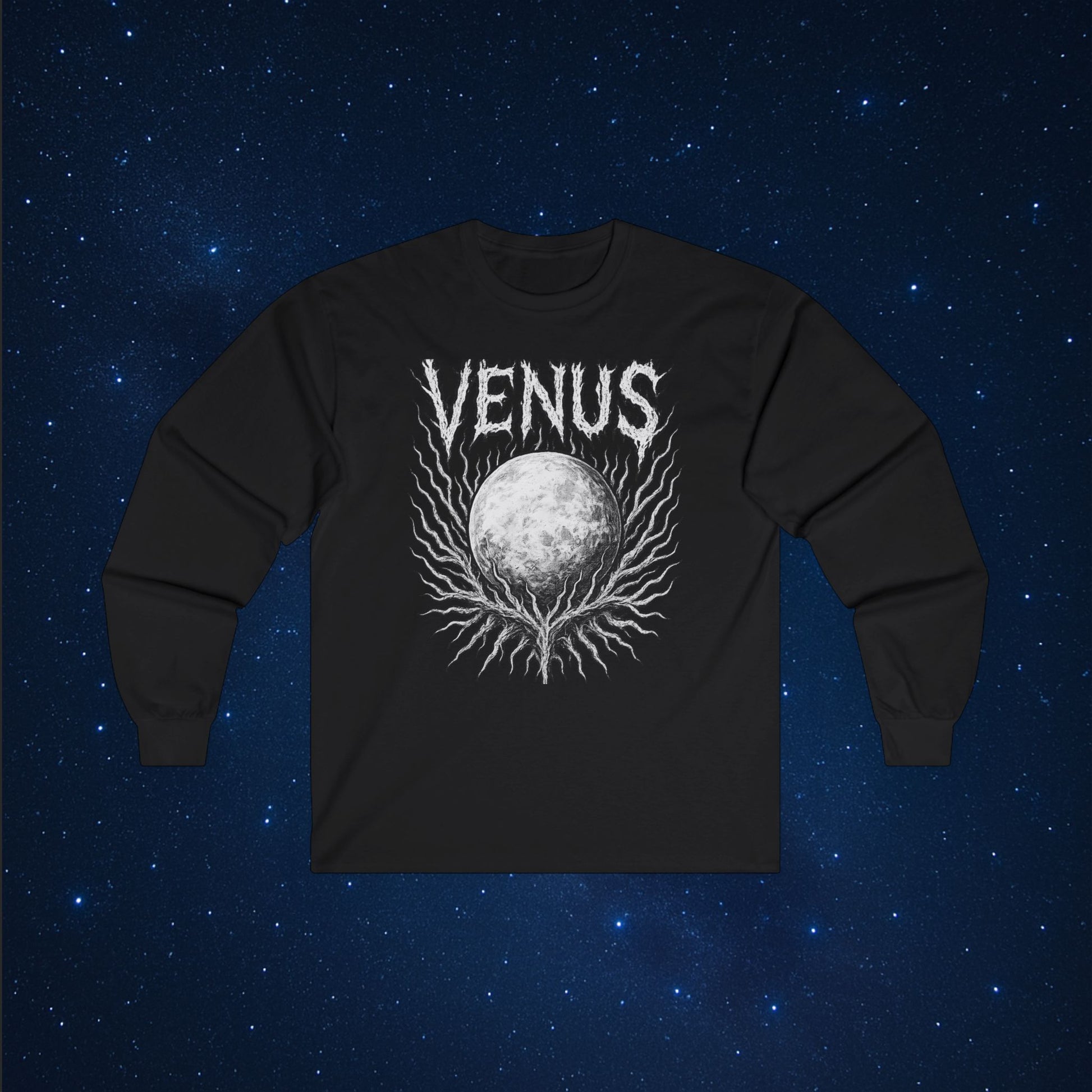 Your Venus hoodie captures the raw, hostile energy of Earth’s twin — redesigned in the signature AstronaMe heavy-metal style with dense vein-style bone lettering, a spike-mass V-root cluster, and a textured, storm-shrouded Venus sphere.