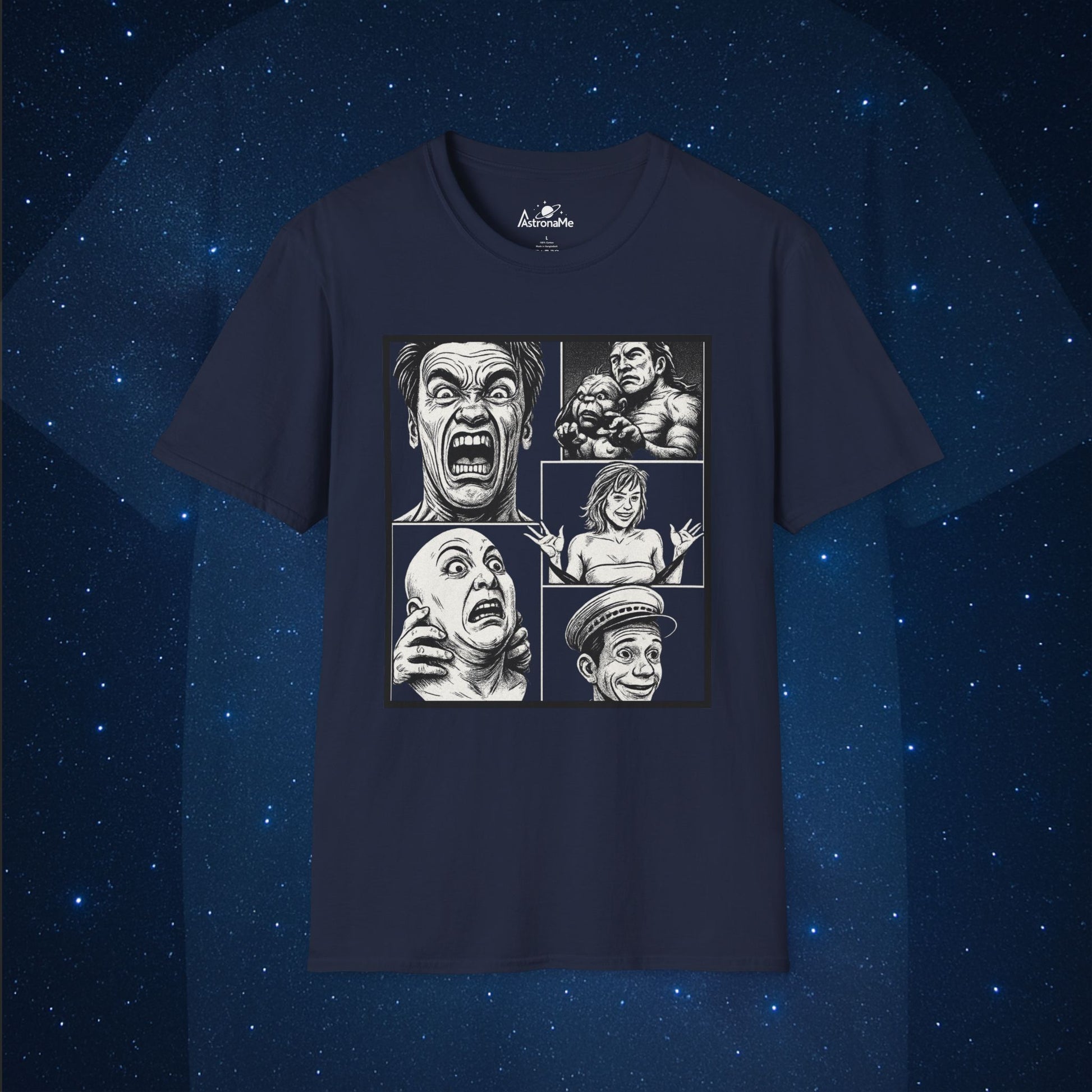 Turn heads with this bold Retro Horror Comic Faces T-Shirt featuring a striking collage of vintage-style horror and pulp comic expressions. The black-and-white artwork captures raw emotion and exaggerated character designs—screams, shock, flexed muscles, and eerie stares—that bring classic cult cinema vibes straight to your wardrobe.